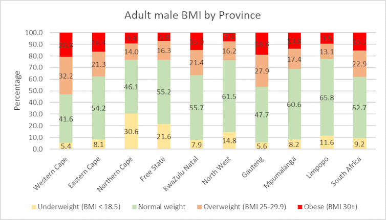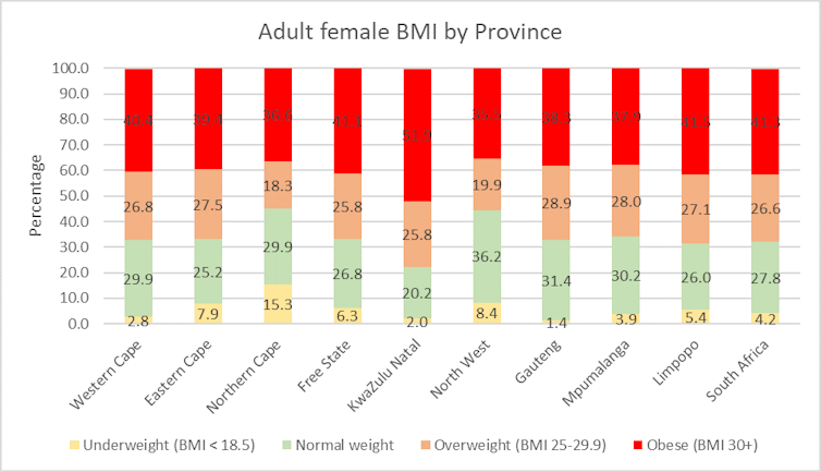 KwaZulu-Natal reported the next prevalence of obesity (39.4%) than other provinces. More research is required to explore this finding and whether cultural aspects are behind it.